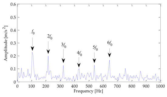 Next, the outer ring fault signal after signal noise reduction was demodulated by the Hilbert envelope to extract the fault feature. To furtheranalyze the fault feature extraction effect of the proposed method more intuitively, LMD–RobustICA, EMD–RobustICA, and EMD–RobustICA methods were used to denoise the signal. Then Hilbert envelope spectrum was generated. The envelope spectra obtained based on the above methods are shown in Figure 41, Figure 42, Figure 43 and Figure 44, respectively. Through the analysis of Figure 41, Figure 42, Figure 43 and Figure 44, it can be seen that the frequency doubling component of the outer ring fault characteristic frequency could be extracted by using the above methods for fault feature extraction. Meanwhile, the peak value of the components of the fault frequency from one to six times frequency is much higher than that obtained by the other three methods. The surrounding interference could not affect the identification of frequency doubling. However, the peak value of fault characteristic frequency in the envelope spectrum based on the other three methods was relatively low, and the interference components near these frequencies were close to the fault characteristic frequency. This brought some interference to fault feature extraction.