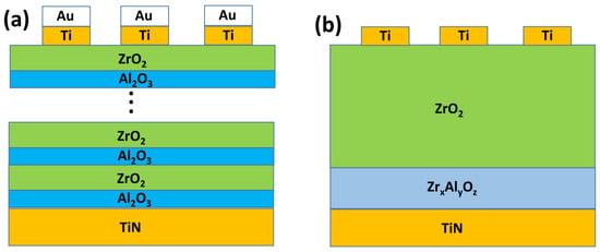 Schematic representation of (a) periodical ZrO2:Al2O3 structures and (b) ZrO2 films grown on buffer ZrxAlyOz layers on bottom TiN electrodes. The component-material layer thicknesses are not to scale.
