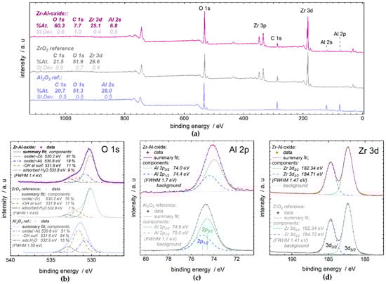 Comparison of the O 1s spectra (Figure 2b) allowed one to recognize surface hydroxyls present in similar minor amounts in both ZrxAlyOz and ZrO2 reference films, but in much lesser amounts than in the Al2O3 reference film. The binding energy of the hydroxyl groups, however, coincides with that attributed, in an earlier study, to oxygen vacancies at neighboring sites [51]. There with the possible presence or absence of such defects in different samples can be rationalized to a certain degree by looking at elemental abundancies. At first, the feature just below 532 eV binding energy (Figure 2b, an orange dashed component line) is strong in the O 1s spectrum of the Al2O3 sample, where the content of oxygen is above that required for Al2O3 stoichiometry, which therefore suggests the presence of OH groups rather than oxygen vacancies. In the ZrxAlyOz, the oxygen content, which was estimated from the survey spectrum (Figure 2a), was lower than that in the corresponding stoichiometric oxide. The latter observation could indicate the likely presence of oxygen vacancies, considered to be also present in the alumina-stabilized zirconia studied in an earlier work [51].