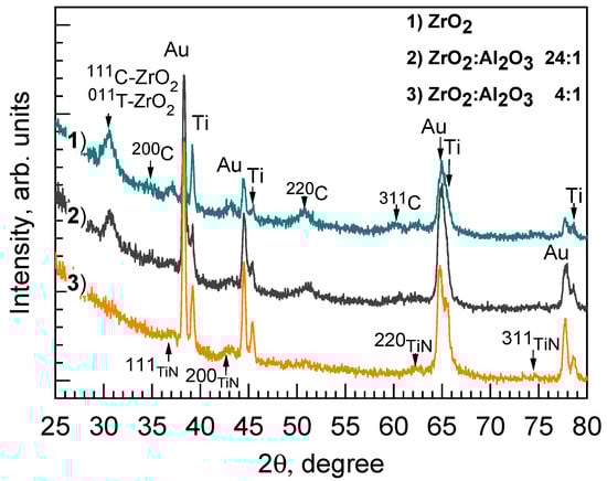 GIXRD patterns from (1) pure ZrO2 and (2,3) periodically layered ZrO2:Al2O3 films deposited by applying single Al2O3 deposition cycles between successive ZrO2 cycles in ratios of (2) 24:1 and (3) 4:1. Patterns were measured from the films supplied with top Au/Ti electrodes. Miller indexes are assigned to the cubic phase of ZrO2, in addition to the reflections attributed to top metal and bottom TiN electrode films.