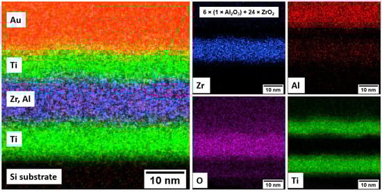 Figure 5 presents the results of STEM-EDX elemental composition mapping carried out on a representative ZrO2:Al2O3 film grown on TiN bottom electrode and supplied with Au/Ti top electrodes. One can clearly see that the constituent films have formed with defined interfaces between the switching medium and mounting electrodes. Quite expectedly, no separate continuous Al2O3 layers have been formed during single Al2O3 deposition cycles, applied periodically between multiple ZrO2 layers, rather a diffuse, mixed-oxide film containing both Zr and Al oxides has been formed.