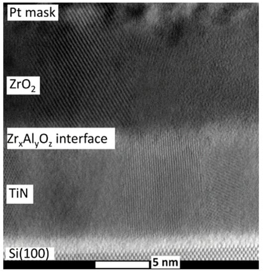 Figure 7 demonstrates a cross-section image from the ZrxAlyOz-ZrO2 stack deposited on a TiN bottom electrode. One can see, that both the main ZrO2 film and the TiN electrode layer contain crystallites with hardly distinguishable boundaries between crystallites with different orientations and between crystallites and amorphous regions. The ZrxAlyOz buffer layer has, quite expectedly, also remained too thin for the unambiguous detection by energy-dispersive X-ray elemental analysis (not shown), as accumulation of aluminum could not be recognized.