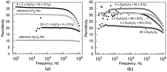 For comparison, studies on composites, or sandwiched and multilayered stack structures consisting of ZrO2 and Al2O3, have reported permittivity values correlated to the relative content of constituents. For instance, in ZrO2-strengthened Al2O3 powders containing 15 wt.% ZrO2, divided to 9 wt.% of tetragonal and 6 wt.% of monoclinic ZrO2 phases, k reached 14 at room temperature [58]. A k value of 20.1 was measured in electron beam evaporated ZrO2–Al2O3 composite films, annealed and partially crystallized as tetragonal ZrO2 [59]. In sol-gel processed crystallized ZrO2–Al2O3 nanolaminates, consisting of 7–40 nm thick ZrO2 and Al2O3 constituent layers sandwiched to total thicknesses of 70 nm, k correlated to the relative content of ZrO2, with edge values of 6.9 and 20.3, characteristic of reference Al2O3 and ZrO2, respectively [60]. Similar behavior in sol-gel deposited ZrO2–Al2O3 nanolaminates was observed and described in another, more recent, paper, as well [61]. Although the alternately layered sandwich structures of Al2O3 and ZrO2 are not necessarily to be regarded as homogeneous mixtures, the effective permittivity values should at least partially follow certain mixing rules relevant to composites of distinct compounds [62,63].