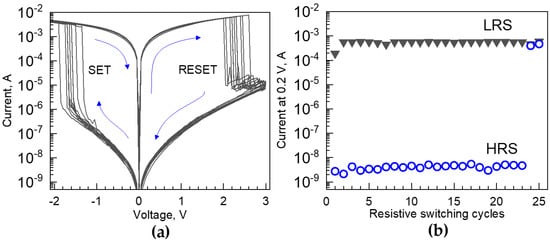 In the 14.6-nm-thick multilayered film grown using the deposition cycle sequence of 6 × (1 × Al2O3 + 24 × ZrO2), clear bipolar switching behavior was achieved (Figure 9a). The SET and RESET voltages were around –1.6 and 2.2 V, respectively. Remarkably, the ILRS/IHRS ratios reached values up to 105. However, despite an initially markedly uniform and wide switching window, the endurance of such devices did not reach acceptable ranges, as the switching collapsed after 25 switching cycles (Figure 9b). For comparison, somewhat analogous switching current–voltage curves have earlier been recorded for Au/HfO2/TiN devices [2,66], whereby the endurance tests allowed monitoring of stable switching during about 102 cycles with an ILRS/IHRS ratio of 104 [66]. Clarification of the reasons behind high, but unstable, current ratios would require further detailed studies, including evaluation after structural modifications. In general, higher switching stability could be a result of higher chemical stability and structural uniformity of the medium in terms of the phase composition. Speculatively, one could expect higher switching stability in the HfO2-based medium, due to its tendency to preferably grow in the stable monoclinic phase, differently from ZrO2 that can more easily occur as a multiphase material comprising stable and metastable phases.