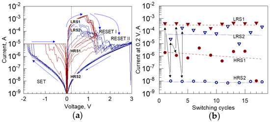 The endurance tests on the 12.2 nm thick reference ZrO2 films revealed marked instability, expressed by a decrease in the ILRS/IHRS values during the first 300 switching cycles (Figure 11b), mainly due to an increase in the conduction currents in the high resistance state during consecutive measurement cycles. However, it was possible to recover the high resistance state value and improve the RS stability during the following 1700 switching cycles (Figure 11b) changing the programming RESET voltage from the starting value of –0.65 V to –0.85 V. After reaching 2000 switching cycles, an abrupt change in the properties of the switching media occurred, as implied by moderate, but clear decrease in the ILRS/IHRS ratio. The decrease could, however, be compensated and the switching ratio restored setting the programming voltage at the RESET event to –1.0 V. The necessity for intentional drift in programming voltage toward higher values was noticed earlier, and the procedure may be regarded as work in process while seeking optimized parameters for stable switching performance. Somewhat speculatively, it may give a hint about that more conductive pathways or filaments can start to form after multiple switching cycles. Alternatively, and possibly, just one relatively large filament might also form, which in any case would require higher electric field strengths for disruption during RESET events. Specific kinetics analysis would require in depth investigations by high speed and precisely time controlled short pulses that would allow one to estimate and model the process [74].