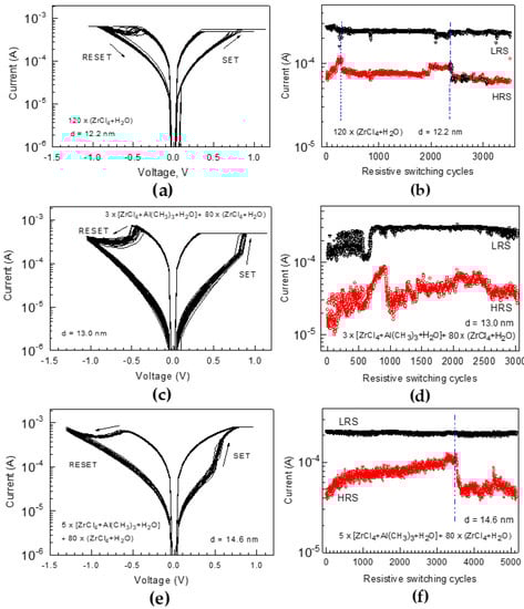 The samples based on ZrxAlyOz-ZrO2 stacks that contained the interfacial layers grown by applying 3 ZrxAlyOz cycles exhibited more stable counterclockwise switching (Figure 11c) with ILRS/IHRS ratios extending to values of 30–40. Such a difference in the switching direction compared to that obtained in multilayer ZrO2:Al2O3 structures might indicate that the deposition of the ZrxAlyOz layer caused an increase in defect (vacancy) density at the interface between TiN and ZrO2, whereby the Al-rich interface served as a source of oxygen vacancies and conduction electrons. Relatively uniform switching could, after initial device stabilization over about a thousand cycles, easily become extended over 3000 cycles (Figure 11d), similarly to that observed in the reference ZrO2 (Figure 11b). The latter is indicative of the necessity for the application of work-in cycle sequences after formation pulses, before the reliable switching process can be induced. It is, thus, worth underlining, that counterclockwise switching direction dominated in all ZrxAlyOz-ZrO2 stacks as well as in reference ZrO2 film (Figure 11), whereas in the case of periodically layered ZrO2:Al2O3 films the clockwise switching was established (Figure 9 and Figure 10). Reasons for the changes in the switching direction may not yet be unambiguously determined and explained at this stage of studies. Nevertheless, one might suppose that, in the case of ZrxAlyOz-ZrO2 stacks, the ZrxAlyOz buffer layers have indeed served as reservoirs for defects, promoting channeling electronic currents under positive bias first, whereas in the case of periodically layered ZrO2:Al2O3 media, the surface of the deposited film below the top metal electrode contact might have remained and regarded as the most defective junction of the whole structure.
