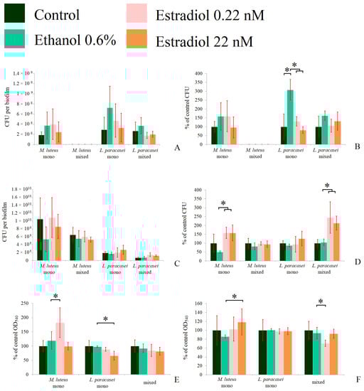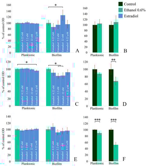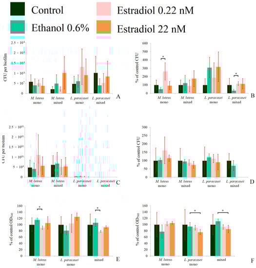 First, the monospecies planktonic culture growth in the presence of estradiol in comparison with vehicle controls (0.6% ethanol) was analyzed. Then ethanol samples were compared with controls without additions. M. luteus was incubated under aerobic conditions, while L. paracasei was tested both under aerobic and anerobic conditions. Neither 0.6% ethanol nor estradiol had effects on the planktonic cultures of M. luteus C01 (Figure 1A,B). The hormone reduced the OD of L. paracasei cultures by 5% at the highest concentration under aerobic cultivation, in comparison with 0.6% ethanol (Figure 1C). The effect was marginal, and it was difficult to determine any biological explanation; however, it was reproducible and statistically significant. Ethanol had also a marginal inhibitory effect (Figure 1D). Under anaerobic conditions, the effect of ethanol became statistically significant (Figure 1F), but no effect of the hormone was demonstrated.