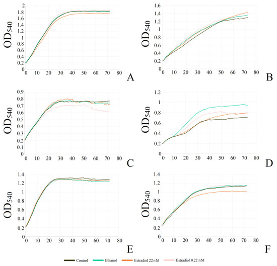The results of the mixed-species cultures and biofilms in our experiments appeared to fall between the results of M. luteus and L. paracasei monospecies cultures and biofilms (Figure 2E,F, Table 1). There was no effect from the tested compounds on the planktonic cultures; however, biofilm growth was altered in the presence of 22 nM estradiol. In the beginning, the growth rate was higher than in the presence of ethanol; later, the biofilm yield OD540 decreased. Thus, it could be suggested M. luteus has an advantage in the first stage of growth, with a subsequent balance shift to L. paracasei.