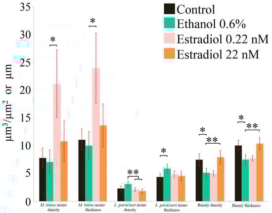 The mixed-species biofilms after 72 h mostly contained L. paracasei and very marginal M. luteus; thus, the contribution of Micrococcus biomass in binary biofilms after 72 h can be overlooked. Nevertheless, it is interesting that in this system, the biomass density and thickness of mixed-species biofilms increased in the presence of a higher concentration of estradiol in comparison with the ethanol control, while ethanol reduced those parameters significantly. It can be proposed that M. luteus has a positive impact on L. paracasei in binary systems; hence, the effects of estradiol may change significantly. Visualization of the biofilms is presented in the Supplementary Materials, Figure S2.