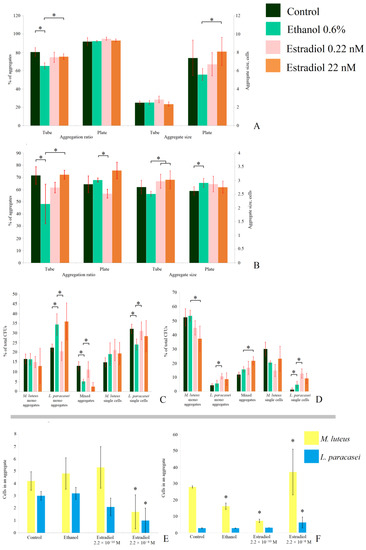 In the solid medium, the effects of active compounds on aggregation in mixed-species biofilms varied (Figure 6D,F). First, we found that L. paracasei was not totally eradicated—about 8–20% of all potential CFUs were L. paracasei single cells or aggregates. The absence of L. paracasei colonies should be a consequence of the potential dormancy of lactobacilli, due to unfavorable conditions in a mixed population. Moreover, the numbers of monospecies aggregates of L. paracasei and mixed-species aggregates were increased in the presence of the hormone, while monospecies M. luteus aggregates were reduced in number. Aggregates were several times larger than in the tubes (Figure 6F), and at different concentrations, estradiol had a controversial effect: at the concentration of 0.22 nM, it decreased the M. luteus portion in mixed-species aggregates (16.2 ± 2.8 M. luteus cells in the ethanol samples and 7.3 ± 1 in the presence of the hormone). At the concentration of 22 nM, the hormone increased the number of cells—37 ± 14 cells of M. luteus and 6.2 ± 3.3 cells of L. paracasei—while in the ethanol samples there were 2.8 ± 0.1 lactobacilli cells per aggregate. Thus, it can be suggested that the balance of M. luteus colonies in mixed-species biofilms (no effect of estradiol; Figure 5) was achieved by shifting between single cells, monospecies, and mixed-species aggregates, which were caused by active compounds. Furthermore, some of the M. luteus colonies seem to have originated from mixed-species aggregates. Thus, the hormone acts as a mediator for cell-to-cell aggregation, and its action depends on the concentration.