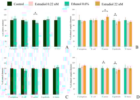 Antibacterial activity of L. paracasei against test strains under aerobic (A,B) and anaerobic (C,D) conditions. (A,C): the impact of ethanol in comparison with the control without additions; (C,D): impact of the hormone in comparison with ethanol. * denotes p ˂ 0.05.
