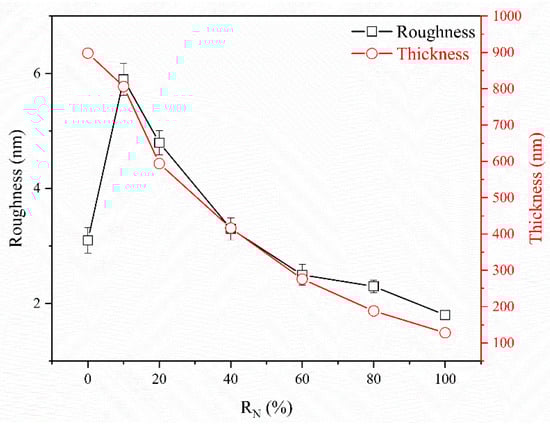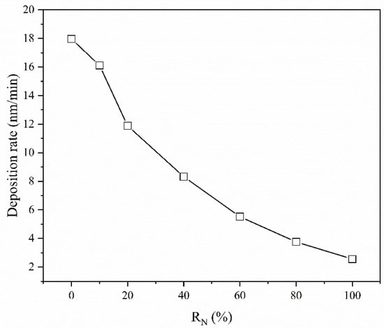 Figure 1 shows the deposition rate of the (CrHfNbTaTiVZr)N coatings deposited at various RN values. The deposition rate of the film gradually decreased from 15.0 nm/min to 2.1 nm/min. The decrease in the deposition rate of the coatings can be interpreted in terms of three factors. (1) The poisoning of the target surface occurs during the reactive sputtering process. A higher RN promotes higher target poison, which results in a lower deposition rate. This occurrence is reasonable because the sputtering yield of the nitride is lower than that of the metal. (2) The ionization threshold of the N2 atom is remarkably higher than that of the Ar atom, which weakens the plasma and reduces the deposition rate [,].
