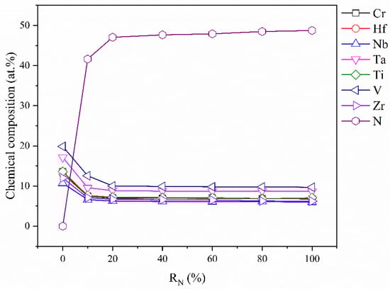 Figure 2 plots the ESCA element concentration in the (CrHfNbTaTiVZr)N coatings deposited at various RN values. The elemental compositions of the (CrHfNbTaTiVZr)N coatings differed from the equiatomic target composition. The discrepancy in the composition of each element may be highly correlated with gas scattering, sputtering yield, and sputtering angle distribution []. The multiple overlap among different signals from these target constituents impedes the quantitative analysis of the coatings and affects the accuracy of the determination of the metal content of coatings. This unexpected compositional change has also been reported in other literature []. Therefore, the change in metal concentration in coatings will not be explored in this paper. The nitrogen content in coatings rose rapidly at first and then stabilized with the increase in RN. The coatings deposited at RN = 20% and above can be regarded as saturated nitride films. Among the target constituents, Cr, Hf, Nb, Ta, Ti, V, and Zr are all strong nitride formers based on the mixing enthalpy (ΔHmix) for target constituents and N element (ΔHmix values of −107, −218, −174, −173, −190, −143, and −233 kJ/mol, respectively). Thus, multicomponent nitrides based on strong nitride formers are prone to having high nitrogen contents when deposited at the same RN. Current research has started to provide the same insights [].