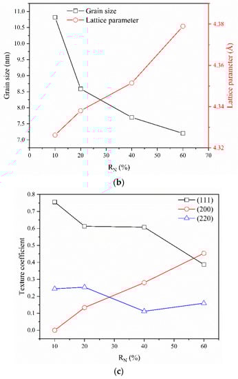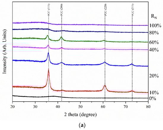 Figure 3a shows the XRD patterns of (CrHfNbTaTiVZr)N coatings deposited at various RN values. On the basis of the XRD analysis, the grain sizes and lattice parameter were determined (Figure 3b). The coatings deposited at RN = 0% exhibited an amorphous structure, as illustrated by the broad peaks. According to the literature, the large atomic size difference is considered the main factor for the formation of the amorphous structure []. The atomic size difference in an alloy is quantified by δ: