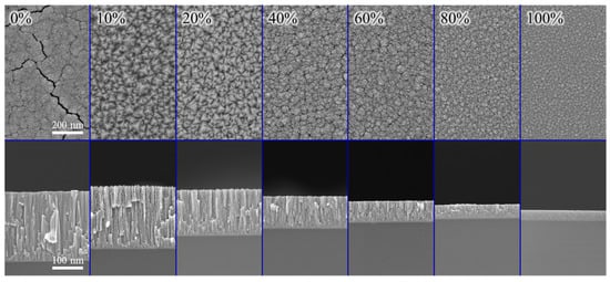 The (CrHfNbTaTiVZr)N coatings were deposited on p-Si (100) wafers by the reactive magnetron sputtering method. The target size was 100 mm in diameter and 6 mm in thickness. The target was made with equiatomic amounts of Cr, Hf, Nb, Ta, Ti, V, and Zr elements (adjusted to 14.3 at.% for each element) by vacuum arc melting. The target melting procedure was repeated at least five times to guarantee chemical homogeneity. The Si wafer was chosen as the substrate to facilitate structural analyses, such as scanning electron microscopy (SEM, JEOL JSM-6700F, JEOL Ltd., Tokyo, Japan) and transmission electron microscopy (TEM, JEM 1200EX II, JEOL Ltd., Tokyo, Japan) observations. Before deposition, the Si wafer was ultrasonically cleaned and rinsed with ethanol and distilled water. The vacuum in the sputtering chamber was pumped down to 2 × 10−4 Pa by utilizing a turbo pump. The deposition of the (CrHfNbTaTiVZr)N coatings was carried out in a mixture atmosphere of high-purity Ar and N2. The discharge power of the CrHfNbTaTiVZr alloy target was maintained at 200 W. The working distance from the target to the substrate was set at approximately 150 mm. The working pressure was 1 Pa, and the deposition time was 50 min for all the coatings. RN was varied from 0% to 100%. No external substrate heating or biasing was employed during deposition.