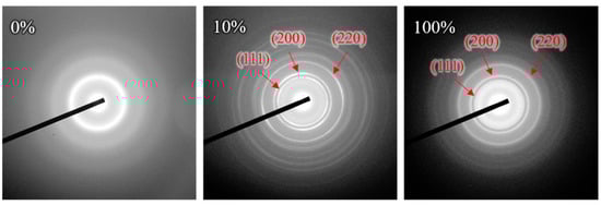Figure 6 and Figure 7 show the TEM images and the selected area electron diffraction (SAED) patterns, respectively, for (CrHfNbTaTiVZr)N coatings deposited at various RN values. The CrHfNbTaTiVZr alloy coatings deposited at RN = 0% revealed a porous columnar structure. Each column consists of bundles of nanometer-sized fibers. The corresponding SAED patterns contain diffuse rings that can be assigned to an amorphous structure. This structure is consistent with the zone Ia structure of the Mahieu model []. The mean free path in the plasma is low at high deposition pressure. The sputtered particles undergo numerous collisions with the process gas before arriving at the surface of the growing film during deposition, which results in the loss of their kinetic energy. The coating structure has an amorphous appearance because the adatoms have not enough energy to develop large and compact crystals. An overhang structure can be formed by combining this with the shadow effect. Such a coating has an open-voided tapered fibrous structure with an amorphous phase and is classified as a zone Ia coating. When RN increased to 10%, the coating became a typical columnar structure with a highly faceted surface feature. The introduction of nitrogen increased the Ji/Jmetal flux ratio toward the substrate and thus enhanced the surface mobility of adatoms to expedite diffusion among planes. This occurrence induced a local crystal growth condition; thus, each crystal grew into dense and clearly faceted columns with a crystalline phase. The sharp FCC diffraction rings in the SAED pattern confirm the good crystallinity of the coating. However, the adatoms were still unable to overcome the existing diffusion barriers among grains. Local crystal growth exacerbates the shadow effect, resulting in deep cusps between columns and open-column boundaries. The microstructure changed from zone Ia to zone Ic. As RN increased to 100%, the surface became non-faceted and smooth without a visible void. The poor crystallinity feature can be identified through the broad FCC diffraction rings in the SAED pattern. The enhanced bombardment on the growing coating was large enough to interfere with column growth and drive re-nucleation, leading to structural densification and grain refinement. The voids between columns were completely filled, and a compact structure evolved. This structure can be considered a zone Ib coating. Notably, coating thickness is also a key determinant on the microstructure. A thin nitride coating is associated with small grain size and low surface roughness (Figure 4 and Figure 7) [,,].