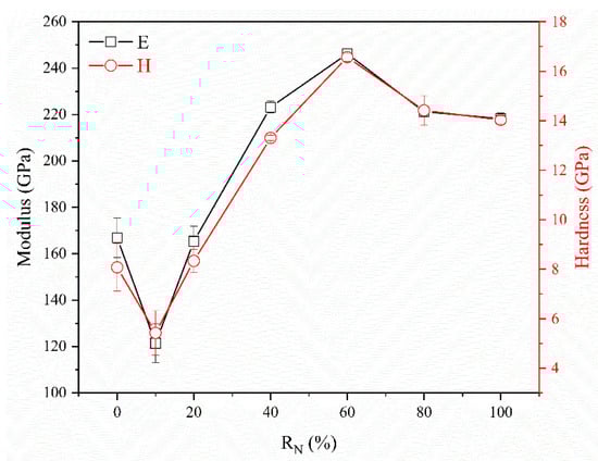 Figure 8 shows the hardness and modulus of the (CrHfNbTaTiVZr)N coatings deposited at various RN values. The CrHfNbTaTiVZr alloy coating exhibited a hardness and a modulus of 8.1 and 166.9 GPa, respectively. The hardness and modulus slightly increased to 5.4 and 121.4 GPa at RN = 10%, respectively. The high hardness can be attributed to the formation of multiple strong nitrides. However, the magnitude of hardness increase in this study was extremely small. This finding can be ascribed to the deep cusps between columns and open-column boundaries. As RN increased, the hardness and modulus increased initially and reached the maximum values of 16.6 and 246.2 GPa, respectively, at RN = 60%. The primary reason is the markedly reduced density of voids existing between the column structures, which enhances the hardness effectively. The second reason is the grain refinement that impedes dislocation motion during plastic deformation. The coating deposited at RN = 60% had the maximum hardness, which can be attributed to its denser columnar structure and smaller grain size than other coatings. Further increasing RN to 100% slightly decreased the hardness and elastic modulus to 14.0 and 218.3 GPa, respectively. The formation of an amorphous structure at high RN is usually associated with low hardness. Dislocations cannot be defined in an amorphous material. A deformation mechanism, such as grain boundary sliding, was proposed to appear at very fine grain sizes approaching the amorphous state and lead to the softening of materials [].