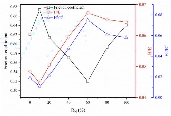 Figure 9 shows the friction coefficient, H/E, and H3/E2 ratios of the (CrHfNbTaTiVZr)N coatings deposited at various RN values. The friction coefficient of the CrHfNbTaTiVZr alloy coating was 0.65. With the introduction of nitrogen, the coating was nitrided and exhibited an increased friction coefficient of 0.67. The friction coefficient initially decreased and then increased with increasing RN. The friction coefficient of the (CrHfNbTaTiVZr)N coating reached the lowest value of 0.52 at RN = 60% and then increased to 0.64 at RN = 100%. The variation in friction coefficient is related to surface roughness and mechanical properties. The low surface roughness can reduce frictional resistance. However, in this study, (CrHfNbTaTiVZr)N coatings do not follow the same trend of reduced friction coefficient with surface roughness. According to Leyland and Mayrhofer, H/E represents the elastic strain to failure, and H3/E2 represents the resistance to plastic deformation [,]. These values can be calculated to assess the relevance of coatings for tribological applications. High H/E and H3/E2 values indicate improved tribological properties. Figure 9 clearly demonstrates that the friction coefficient, H/E, and H3/E2 present a similar variation tendency with RN. Notably, a very sharp increase in friction coefficient was observed in the (CrHfNbTaTiVZr)N coatings deposited at the RN values of 40% and 50% even though they have low surface roughness and high H/E and H3/E2 values. The thinness of the coating may be responsible for this abnormal phenomenon [].