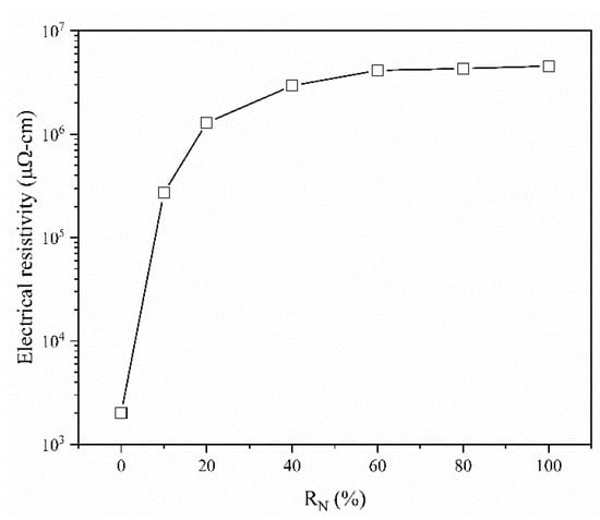 Figure 10 shows the electrical resistance of the (CrHfNbTaTiVZr)N coatings deposited at various RN values. The electrical resistance remarkably increases from 201 Ω·cm to 456410 Ω·cm by increasing RN to 100%. Notably, the increase in electrical resistivity was stronger when RN was below 20%. This phenomenon can be attributed to the enhanced covalent or ionic character in the metal–N bonding with increasing nitrogen content []. The nitrogen content of the coatings became stable at RN above 20% as shown in Figure 2. The decrease in electrical resistivity at RN > 20% is triggered by the grain boundary scattering caused by the small grain size, as shown in Figure 3c.