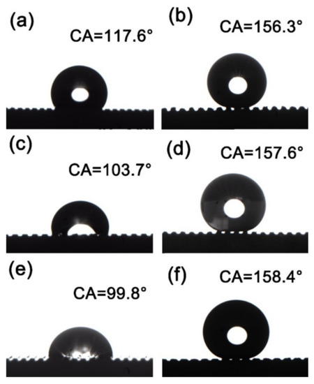 Droplets usually stay on the rough surface in two states. The first state is that liquid fills every gap of the rough surface, which is called the Wenzel wet state. In the second state, the liquid droplets only make contact with the peaks protruding from the rough surface, while a large number of air pockets remain in the gaps between the peaks, which is called the Cassie wet state. In the Wenzel state, the liquid–solid contact in a large area makes the liquid droplets strongly adhere to the rough surface, and the movement of the liquid droplets becomes extremely difficult. In contrast, in the Cassie state, due to the incomplete contact between the liquid and solid, the adhesive force between liquid droplets and the rough surface is low, and there are many air pockets at the same time. When sufficient roughness and an appropriate contact angle are reached, the superhydrophobic condition of highly movable liquid droplets can be realized. The experimental results show that, after milling and deburring treatment, the Cu surface has a CA larger than that of the unprocessed one. As the cutter tip distance decreases, the CA of the sample surface increases, and the contact between the surface and the droplets conforms to the Wenzel model where the air at the groove is drained by water and the surface is in a state of high viscosity [20]. Figure 4b,d,f shows the surface of the sample modified by chemical deposition and stearic acid after milling. With gaps between the sample surface and the droplets, the contact between the surface and the droplets is in accordance with the Cassie model [21]. Here, the air in the groove is not emptied, and the CA of the sample increases with the increase in the cutter tip distance.