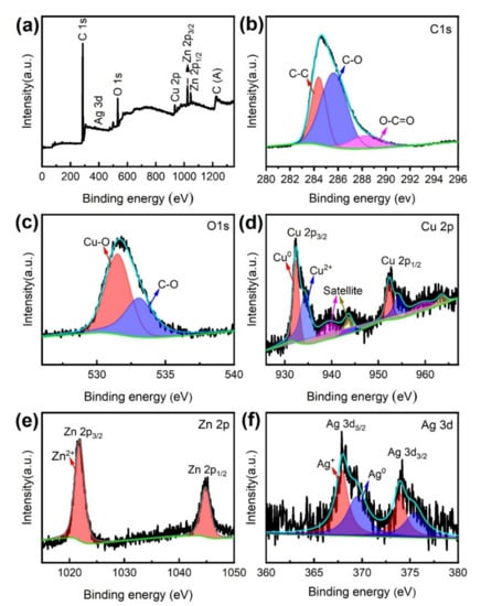 (a) XPS full scanning spectrum of MS/Silver@SA sample, narrow scanning spectrum (b) C 1s, (c) O 1s, (d) Cu 2p, (e) Zn 2p, (f) Ag 3d.