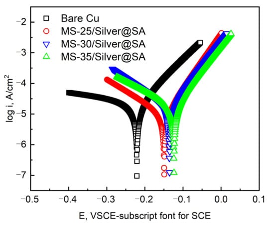 The results show that the Icorr and Ecorr of the Cu substrate are 2.92 × 10−5 A/cm² and −0.2208V, respectively. The Icorr and Ecorr of MS-25/Silver@SA, MS-30/Silver@SA, and MS-35/Silver@SA samples are 1.80 × 10−5 A/cm², 9.87 × 10−6 A/cm², and 1.88 × 10−5 A/cm² and −0.1354, −0.1492, and −0.1236 V, respectively. Based on electrochemical theory, with good corrosion resistance, materials have low positive values of Icorr and Ecorr [27]. The results show that the corrosion current density of the MS/Silver@SA sample is lower than that of the Cu substrate, which indicates that the surface of the MS/Silver@SA sample really improves the corrosion resistance of the Cu substrate. When the cutter tip distance is 0.30 mm, the sample has the best corrosion protection performance, while the current density and corrosion speed are the lowest.