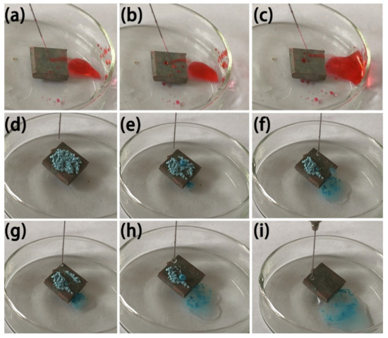 To test the self-cleaning effect of the MS/Silver@SA sample, the antifouling performance test was carried out, using blue chalk dust as the test powder. We ground the blue chalk into powder, sprinkled it on the surface, and placed the sample slanted in the petri dish, as shown in Figure 10d. Figure 10e–i shows the rolling of water droplets off the sample surface will take away part of the blue chalk dust absorbed by the water droplets. With more and more water droplets, chalk dust can be easily removed with the rolling droplets (Figure 10i). The test results show the good self-cleaning effect of the MS/Silver@SA sample.
