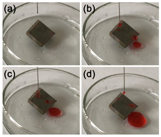 Knife scraping test image of MS/Silver@SA sample. (a) Dripping, (b,c) Water drop contact, (d) Water droplets roll out.