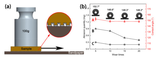 In a previous study, Ras et al. [35] reported that linear abrasion could be used to evaluate the mechanical durability of the superhydrophobic coating, and this wear-test method could be applied in most lab research studies and industrial production, which can generate a large, uniform surface suitable for wetting measurements. In this work, linear friction and wear tests were performed on the sample to study the mechanical durability of the sample surface. First, 2000# silicon carbide sandpaper, a 100g weight, and a tension meter were prepared. The sandpaper was then horizontally spread on a table and the untreated Cu substrate and MS-30/Silver@SA sample were placed under the tension meter. A parallel force was enacted to ensure the samples could move at a uniform speed, and the pulling distance was 21 cm, as shown in Figure 12a. The wear of the Cu substrate and the MS-30/Silver@SA sample was recorded by stretching them 5, 10, 15, and 20 times, respectively, as shown in Figure 12b.