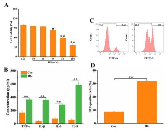 For observing the change of oral mucosal cells viability, various concentrations of glucose (0, 10, 20, 35, 50, and 100 mM) were used to expose the oral mucosal cell in the present study. Cell viability decreased significantly for oral mucosal cells at the concentrations of 35 mM (p < 0.05), 50 mM (p < 0.01), and 100 mM (p < 0.01) (Figure 1A). Later, HG concentration was chosen as 50 mM for the following experiments. The concentration of pro-inflammatory cytokines, TNF-α, IL-1β, IL-6, and IL-8 in oral mucosal cells was measured by ELISA; under HG-stimulated condition, the TNF-α, IL-1β, IL-6, and IL-8 secretion was significantly increased (Figure 1B). Meanwhile, a significant increase of the level of ROS by HG in the oral mucosal cells was observed (Figure 1C,D). Taken together, the above results suggested that HG could induce oral mucosal cell damage and arouse inflammatory responses.