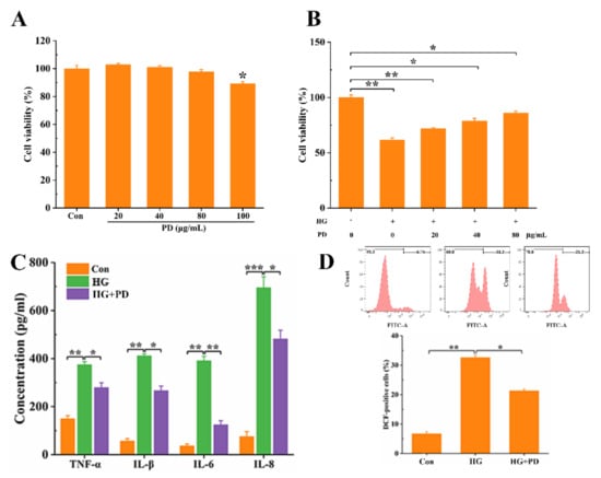3.2. PD Inhibits HG-Induced Oral Mucosal Cells Inflammatory Responses