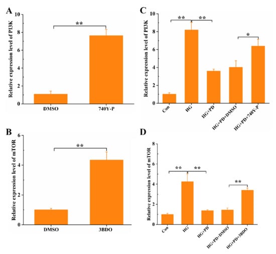 PD suppresses the expression of PI3K/mTOR pathway. The oral mucosal cells were treated with 740-YP (20 μM), 3BDO (60 μM), HG (50 mM), and PD (80 μg/mL); the expression of PI3K (A,C) and mTOR (B,D) was detected by RT-PCR. * p < 0.05, ** p < 0.01.
