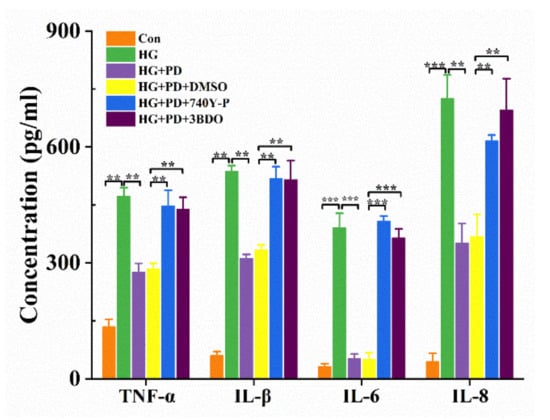 The production of pro- and anti-inflammatory cytokines was regulated by mammalian target of rapamycin (mTOR) and phosphoinositide 3-kinase (PI3K). To further clarify the nature of PD-inhibited inflammatory responses, ELISA was used to detect pro-inflammatory cytokines of oral mucosal cells treated in different conditions. The detection of secretion showed that PD decreased TNF-α, IL-1β, IL-6, and IL-8 secretion in HG-treated oral mucosal cells; however, through combined use of 740-YP and 3BDO, TNF-α, IL-1β, IL-6, and IL-8 secretion was increased (Figure 4). These results confirm that the reduction of TNF-α, IL-1β, IL-6, and IL-8 mediated by PD in HG-treated oral mucosal cells was associated with PI3K/mTOR pathway.
