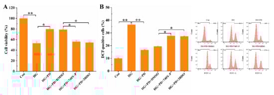 Normal oral mucosal cells were purchased from Shanghai Anwei Biotechnology Co., Ltd. (Shanghai, China); the cells that were cultured contained 5% CO2 at 37 °C, in a basal culture mediμM DEME (Gibco, New York, NY, USA, dulbecco’s modified eagle medium) containing 100 μg/mL streptomycin, 100 U/mL penicillin, pH 7.2, and 10% fetal bovine serμM (FBS). Then, oral mucosal cells were seeded in 6-well dishes and treated with glucose (10, 20, 35, 50, 100 mM) at 37 °C for 48 h with 5% CO2. Moreover, before the HG treatment, the oral mucosal cells were predisposed by PD for 6 h from 0–10 μM. The methanol treatment was the same as in the control group. The PI3K/AKT activator (740-YP, 20 μM, Sigma, New York, NY, USA, Phosphoinositide-3-Kinase/Threonine Kinase) and mTOR activator (3BDO, 60 μM, Sigma, New York, NY, USA, Mechanistic target of rapamycin kinase) predisposed the oral mucosal cells for 24 h before the HG treatment in the follow-up correlative experiments.