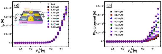 Figure 4a shows the output characteristics in the dark condition of n-MoSe2/p-BP when MTL Gr was used as the gate. The current (Ids or I32) and voltage (Vds or V32) were measured between contacts (2) and (3), and the gate voltage (V1) was applied at contact (1) (see Figure S3a). As shown in Figure 4a, the n-MoSe2/p-BP heterojunction indicated a p-type channel, which implies that the transport was dominated by holes in the valence band in BP (Figure 2b,c). The shift in the drain–source voltage to negative values as the gate voltage increased, as observed in the n-MoSe2/p-BP heterojunction and illustrated in the inset of Figure 2a, was due to the leakage current between the multilayered Gr and MoSe2 flakes. Figure 4b shows the output characteristics in the dark condition of Gr/n-MoSe2 when MTL BP was used as the gate. The current (Ids or I12) and voltage (Vds or V12) were measured between contacts (1) and (2), and the gate voltage (V3) was applied at contact (3) (see Figure S4a). The Gr/MoSe2 heterojunction indicated an n-type channel; therefore, the transport was dominated by electrons accumulated at the SiO2/n-MoSe2 interface and in the multilayered n-MoSe2 (Figure 2a). As illustrated in the inset of Figure 4b, the device indicated an extremely low leakage current and a high on/off current (Ion/Ioff = 6.3 × 103 at a gate voltage of 0.5 V), which can be explained by the potential barrier between n-MoSe2 and p-BP (see Figure 2c). It is noteworthy that both Gr/n-MoSe2 and n-MoSe2/p-BP were in the accumulated mode, as shown in Figure 2a,b.