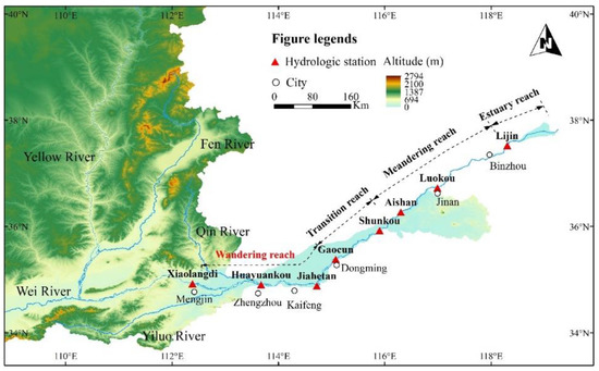 According to the characteristics of different river sections, the downstream channel in the lower Yellow River can be divided into the wandering reach, the transitional reach and the meandering reach (Figure 1). Of these, the wandering channel is located above Gaocun and is 299 km long, with a longitudinal gradient of 0.172~0.265‰. The river is relatively straight, the height difference between the beach and channel is small, the beach land is broad, the river flow is scattered, the section is wide and shallow, the width of the main channel is about 3~5 km and the main stream is uncertain. The river channel is severely scoured and silted, the river regime is strongly wandering, the section shape changes frequently, and the variation range of the river facies coefficient is large. The Gaocun–Taochengpu reach is a transitional reach, with a length of 165 km. The difference in elevation between the beach and channel is relatively greater, the flat beach channel is somewhat narrowed, the position of the main channel of the river is relatively fixed, and the wandering of the river is weakened. Taochengpu–Lijin is a meandering reach with a length of 318 km. The river channel of this reach is narrow and deep, and the height difference between the beach and trough is large. Of these reaches, the wandering channel in the lower Yellow River has frequently burst in historical periods, and thus, this has been the key reach for flood control in the Yellow River and was the key research object in this paper.