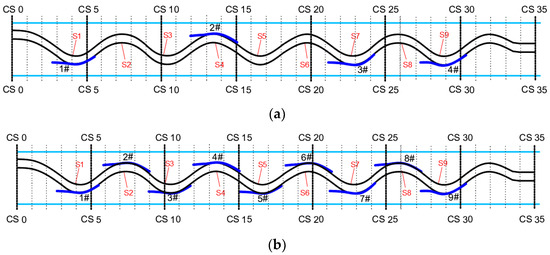 Scheme of the model test layout: S1 to S9 represent river bends. (a) Four regulation works: 1#~4#, respectively, refer to Project 1, Project 2, Project 3 and Project 4. (b) Nine regulation works: 1#~9#, respectively, refer to Project 1, Project 2, Project 3, Project 4, Project 5, Project 6, Project 7, Project 8 and Project 9.