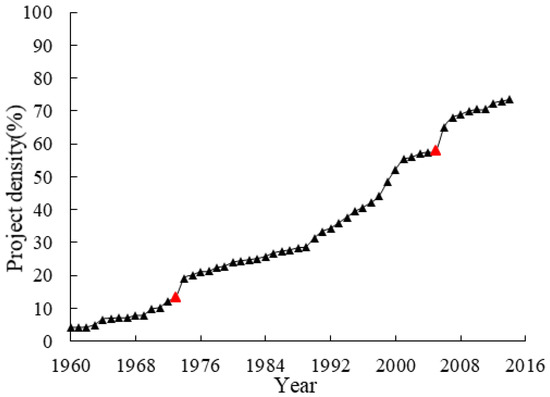 In order to better reflect the construction of wandering channel works, the density of river regulation work was defined as the ratio of the total length of regulation works built in the wandering channel to the length of the river channel. This index reflects the extent to which the river regulation works can restrain the river regime of this reach. The specific process of construction and reconstruction in Baihe–Gaocun reach of the wandering reach in the lower Yellow River is collected. The collected data were sorted according to the year, and the change in the river regulation project densities of this reach from 1960 to 2014 were charted (Figure 4). Here, the river regulation works only include control works that restrict the river regime, excluding the works easily damaged. As can be seen from Figure 4, the engineering densities of this river section are increasing year by year. Through a combination of the inflection point of the change curve in the figure and the actual situation of the river training projects in the lower Yellow River, the construction projects can be roughly divided into three periods, namely 1960–1973, 1974–2005 and 2006–2014. Among these, the period from 1974 to 2005 was the most intensive construction period of wandering channel control projects, and the project density increased from 16% in 1974 to 55% in 2005, with an increase of about 244%. Since 2005, due to the strong artificial constraints on the river channel, most of the river regulation works have involved the reconstruction and expansion of existing projects. By 2014, the density of wandering channel control works reached about 75% [29]. It should be noted that after 2014, the existing control works have been repaired and reinforced according to the location of accidents in the river channel, and few large-scale projects will be built. Therefore, the density of regulation works has changed little after 2014. Therefore, the time range in this article is 1960–2014.