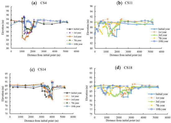 Graphs of different section shapes with four projects: (a–d) respectively show CS4 section, CS11 section, CS14 section and CS18 section morphological adjustment in different years.
