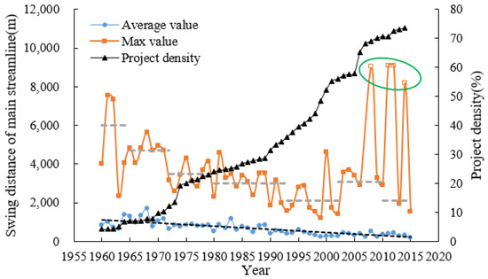 Figure 8 shows the swing of the main streamline in the Tiexie–Gaocun sections in the wandering reach from 1960 to 2014. On the whole, with an increase in the engineering density, the swing distance of main streamline showed a decreasing trend. The maximum swing distance of the main streamline can reflect the real situation of the annual river regime’s swing to a certain extent, and the average swing distance of the main streamline can reflect the overall change in the river regime. With an increase in the engineering density, the maximum swing distance of the main streamline generally decreased. From 2003 to 2006, the swing distance of the main streamline increased, mainly due to the development of distorted river bends such as those at Dagong and O’tan in recent years, resulting in an unstable river regime. In 2008, 2011, 2012 and 2014, the swing range of the main streamline increased suddenly and greatly, which was also due to the formation of distorted river bends at Kaiyi–Zhaogou, Peiyu–Dayulan, Dong’an–Taohuayu, Taohuayu–Huayuankou, Sanguanmiao–Weitan and other river sections, which had a great impact on the river regime.