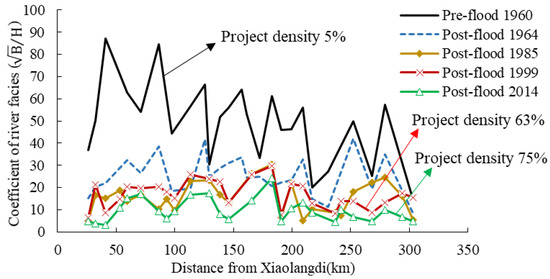 With the increase in the engineering density, the river facies coefficient of the wandering channel generally decreased, and the river section has tended to be narrow and deep. It can be seen that the finite control boundary has had a certain impact on the river facies coefficient. In the Jiahetan–Gaocun reach, where the river regulation was applied earlier and the river regulation project is relatively perfect, the river facies coefficient decreased significantly after river regulation, and the section’s shape tends to be narrow and deep. In the reaches where the river is wide and shallow and the range of change is large, such as the river section above Huayuankou, the river facies coefficient is likely to have a decreasing trend in the near future.