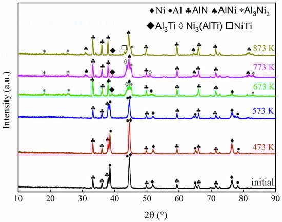 Subsequently, the initially deposited foil was heated to different temperatures and held for 3 h to study phase transformation. After annealing at 473 K and 573 K for 3 h, the intensity of mixed Al and Ti peak gradually decreased implying the atomic interdiffusion upon isothermal annealing; the samples have the same phase composition compared to the as-deposited foil, as shown in Figure 1. When the annealing temperature was raised to 673 K, the peaks corresponding to Al and Ti totally disappeared and the phase composition transformed into Al3Ni2, Ni3(AlTi), as well as a small amount of Al3Ti. Further increasing the annealing temperature to 773 K leads to the appearance of stable AlNi in addition to Al3Ni2, Ni3(AlTi), and Al3Ti. Afterwards, the peak of Ni3(AlTi) could not be detected in the specimen after treating at 873 K for 3 h, and the peak intensity of Al3Ni2 and Al3Ti becomes much weaker. The phase composition changes to be AlNi were accompanied by a few Al3Ni2, Al3Ti, and NiTi. Compared with the results in the literature [], the formation of Al3Ni is significantly inhibited by adding a Ti layer into the base Al and Ni layers. Nevertheless, the emergence of Al3Ni2 at 673 K and AlNi at 773 K has not been impacted. Thus, TEM analysis was again performed to comprehend the mechanisms of phase transition.
