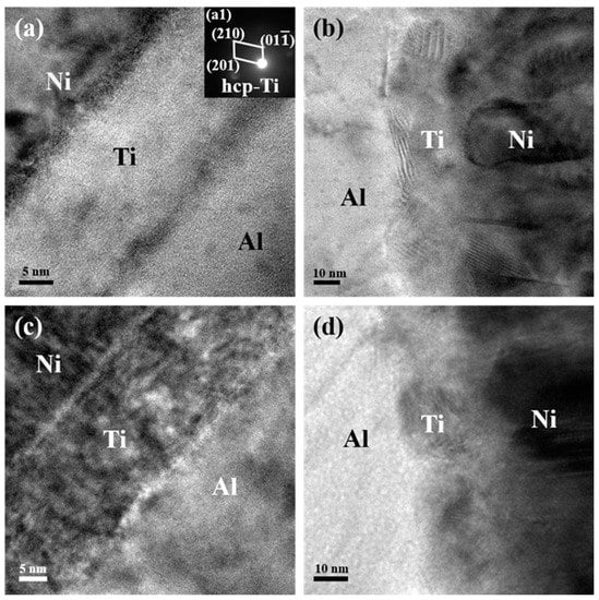 This asymmetric feature could be more distinctly observed in the enlarged TEM images in Figure 3. Apparent interfaces could be found either between the Ni and Ti layers or between the Ti and Al layers in the Ni/Ti/Al interface selected from both the bottom and upper region of the as-deposited ATNT foil as shown in Figure 3a,c. As for the Al/Ti/Ni interface, this characteristic is not much unambiguous (Figure 3b,d). At the same time, the nanobeam electron diffraction pattern was introduced to analyze the phase inner the Ti layers as seen in the inserted Figure of Figure 3a. The SADPs could be indexed to be hcp-Ti, which indicates that no intermetallic phase formed during sample preparation.