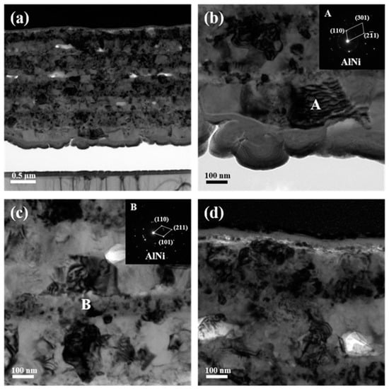 The blocking effect of inserted Ti layers on the interdiffusion between Al and Ni was significantly eliminated as the annealing temperature reached 673 K as shown in Figure 6. The initial Ti layers have totally merged with Al layers, many small grains precipitated inside the initial Al layers, which is consistent with the XRD results with the determination of Al3Ni2 in Figure 1. One thing that should be emphasized is the difference in thickness of the Ni layers. The thickness of the two middle Ni layers is apparently less than that of the initially deposited Ni layer as evident in Figure 6a. This observation was previously reported in the Al/Ni foils deposited on the same substrate, which was related to the interface roughness caused by rougher substrate surface morphology []. This further explains the presence of Al3Ni at the bottom Al layer in Figure 6b. The inserted SADPs obtained from grain A in the bottom Al layer were indexed to be Al3Ni, although which one is not clearly detected in XRD patterns. The slower diffusion rate across the bottom Ni/Ti/Al interface postponed the transformation from Al3Ni to Al3Ni2. In addition, the top Ti layer could still be clearly observed without mixing the Ni layer as displayed in Figure 6c. The obtained result manifests that the added Ti layers have less impact on the phase composition at this temperature even though they hindered atomic diffusion at a lower temperature. It needs to be stressed that the foil is easily delaminated from the substrate when treated at high temperatures, which then conglutinates by adhesive resulting in the gap between the foil and substrate, as well as the presence of adhesive under the foil.