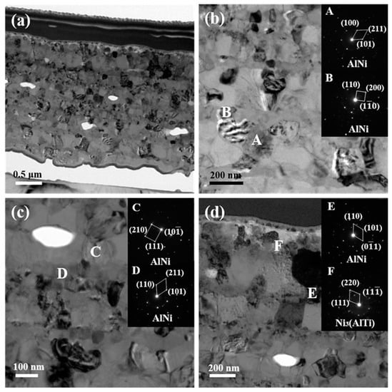 Figure 8 presents the cross-sectional images of the ATNT foils after isothermal annealing at 873 K for 3 h. It can be clearly found that the initial layered structure almost vanished after heating treatment, as shown in Figure 8a, while the grain size is apparently larger than that in the sample after annealing at 773 K (Figure 8a–c). Similar to the results in Figure 7b,c, all the grains marked as A–E selected from the bottom to upper region of the annealed foil were detected to be AlNi. Interestingly, the Ni3(AlTi) phase was determined to be located in the position below the initial top Ti layer, which is due to the unilateral atomic diffusion for the layer close to the surface. Simultaneously, many fine particles formed in the initial pure top Ti layer when annealing at this temperature, which explains the presence of diffraction peaks of NiTi in Figure 1. Combined with the TEM observation in Figure 7 and Figure 8 and the XRD results in Figure 1, it is concluded that, apart from the top Ti and Ni layers, the pure Al, Ni, and Ti layers in other regions of the foils have almost transformed into the AlNi phase despite the existence of a few Al3Ti. However, the peak intensity of the Al3Ti becomes much weaker in comparison to that at low annealing temperature, which means that the Al3Ti dissolved during phase transformation.