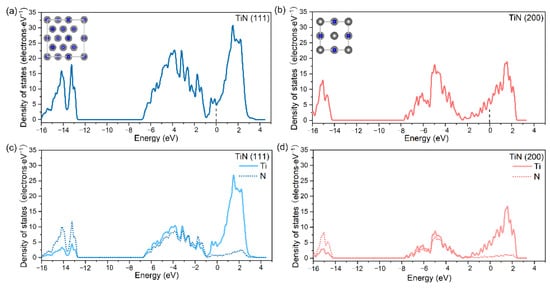 To further understand how different preferred orientation influences the surface electronic conductivity of TiN, the local density of states (LDOS) of the (111) and (200) surface facets using the optimized surface structures are calculated, as shown in Figure 5. Due to the continuous energy band, both the (111) and (200) surface facets are favorable for electron conduction (Figure 5a,b), in which the main contribution of conduction band comes from Ti atoms rather than N atoms (Figure 5c,d). However, for the unoccupied states above the Fermi level (0 eV), the (111) surface facet shows a much stronger peak area than the (200) surface facet (Figure 5a,b), indicating the presence of more free electrons in the (111) plane. Consequently, higher surface conductivity and low ICR values are achieved in TiN films with the (111) preferred orientation.
