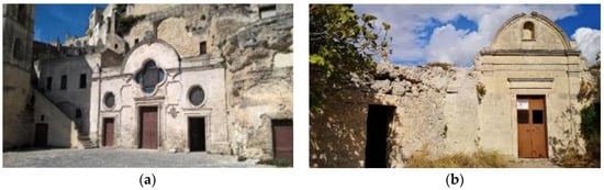 Monumental buildings belonging to the “The Sassi and the Park of the Rupestrian Churches of Matera”, located in the southern Italian region of Basilicata. (a) “San Pietro Barisano” church, a typical example of the rock architecture of the Sass; (b) “Madonna dei Derelitti” church, located on the Gravina side.