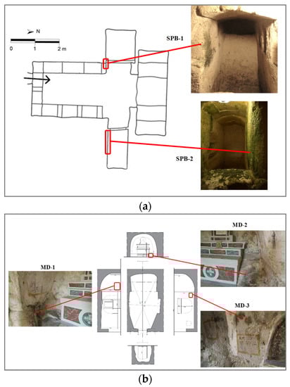 Three different areas inside the church were selected: two areas to the left (MD-1) and right (MD-2) of the altar, entirely excavated in the limestone, and a small, colonized area (MD-3), located in the right wall, probably subjected to whitewashing, as in the lower part there is a fresco (Figure 2b).