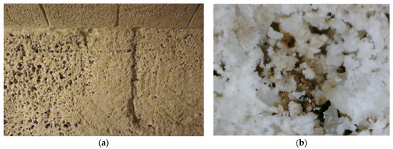 As shown in Figure 4a, the SPB-1 area was highly colonized by deteriorating biofilms, and the stone material on which the biological patina was present showed an evident discoloration, clearly visible to the naked eye. This area was also inspected through portable microscopy, as can be seen in Figure 4d with 4× magnification.