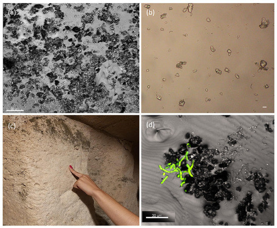 Samples of biofilms were collected from the walls by means of scraping with sterile scalpels or with the nondestructive sampling method of the adhesive tape strips, a consolidated method to collect samples in situ [22]. To characterize the phototrophs in the biofilms, samples were observed with a Zeiss AxioScope light microscope with a 40× objective equipped with a digital camera (Canon EOS 600D—Canon S.P.A., Milan, Italy) for image acquisition. The adhesive tape strips were also observed with an FV1000 confocal laser scanning microscope (CLSM) (Olympus Corp., Tokyo, Japan) with a 60× objective using the autofluorescence channels for chlorophyll a and phycobiliproteins (excitation 488, 543 and 635 nm; emission 520, 572 and 688 nm). Three-dimensional images were constructed from a series of 2D cross-sectional images (x–y plane) that were captured at 0.5 μm intervals along the z-axis using IMARIS 6.2.0 software (Bitplane AG Zurich, Zürich, Switzerland). Scanning Electron Microscopy (SEM)/Energy Dispersive Spectroscopy (EDS) analyses were performed using Zeiss GeminiSEM 500 (Jena, Germany) equipped with EDS Oxford Aztec Energy with INCA X-ACT detector (8.5 mm working distance and 15 KeV accelerating voltage, Oxford Instruments, Abingdon-on-Thames, UK).